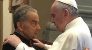 Umarmung mit unterschiedlicher Mimik. 2. April 2017 in Carpi. Der Papst richtete beim Mittagessen nie das Wort an den neben ihm sitzenden Kardinal Caffarra.