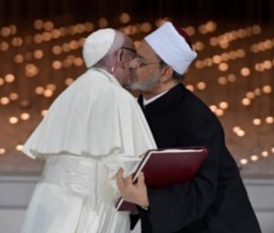 In der Erklärung von Abu Dhabi unterwerfen sich Christen und Muslime dem obersten Prinzip der Freimaurerei, laut dem die Werte der Freiheit und der Gleichheit der Französischen Revolution ihre Synthese und ihre Vollendung in der universalen Brüderlichkeit finden sollten. Ahmad Al-Tayyeb, der den Text zusammen mit Papst Franziskus redigiert hat, ist ein Erbscheich der Sufi-Bruderschaft Oberägyptens. Innerhalb der islamischen Welt zeichnet sich Al-Azhar, die Moschee und Universität, deren Rektor und Leiter er ist, durch die Sufi-Esoterik als eine „initiatische Brücke“ zwischen der Freimaurerei des Ostens und des Westens aus (vgl. Gabriele Mandel: Federico II, il sufismo e la massoneria, hrsg. von Nazareno Venturi, Acireale 2013; dt. Übersetzung: Friedrich II., der Sufismus und die Freimaurerei).[3]