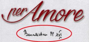 Das Buch trägt den Titel „Per amore“ (Aus Liebe) und ist im Verlag Cantagalli erschienen. Autor ist Joseph Ratzinger Benedikt XVI. So steht es auf der ersten Umschlagseite und auf dem Buchrücken. Dort steht aber noch mehr. Mitten auf der Umschlagseite findet sich, unübersehbar, die faksimilierte Unterschrift von Benedikt XVI., und zwar als „Benedictus PP XVI“.