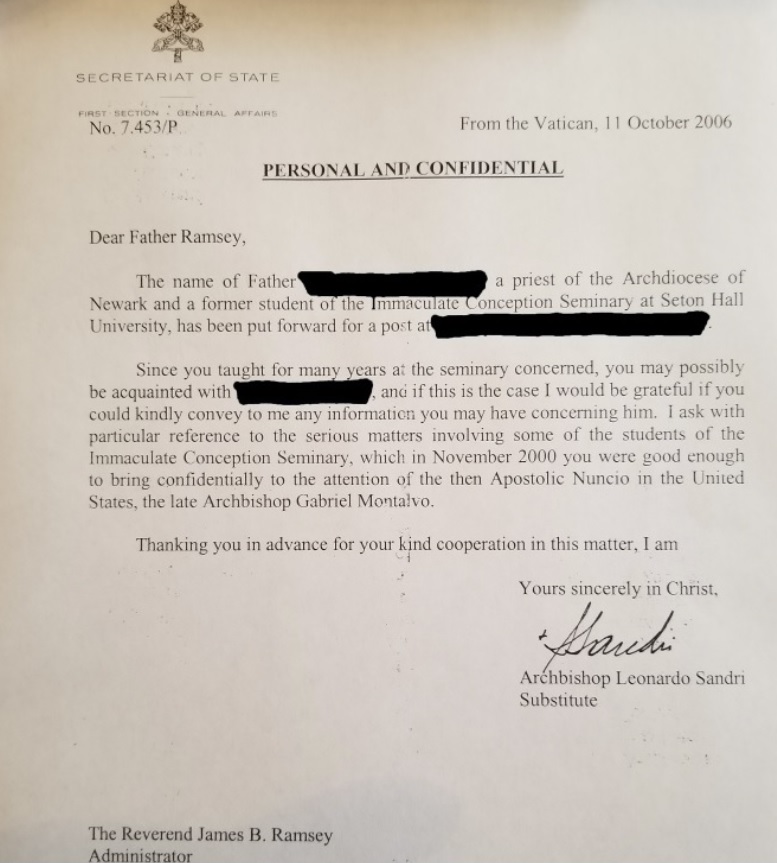 Erst sechs Jahre später erfuhr Ramsey, daß sein Schreiben das Ziel wirklich erreicht hatte. 2006 wurde er vom damaligen Kurienerzbischof Leonardo Sandri kontaktiert, einem hohen Funktionär des vatikanischen Staatssekretariats, der heute Kardinal und Präfekt der Kongregation für die Ostkirchen ist. Es ging um die Ernennung eines jungen Priesters für eine Stelle im Vatikan. Msgr. Sandri wollte wissen, ob dieser Priester in die „Aktivitäten“ am Priesterseminar von Newark verwickelt war, die Ramsey in seinem Schreiben geschildert hatte. „Laut dem was ich wußte, war er nicht verwickelt“, so Ramsey. Durch diese Anfrage hatte er aber endlich die Bestätigung erhalten, daß der Nuntius sein Schreiben an den Vatikan weitergeleitet hatte.